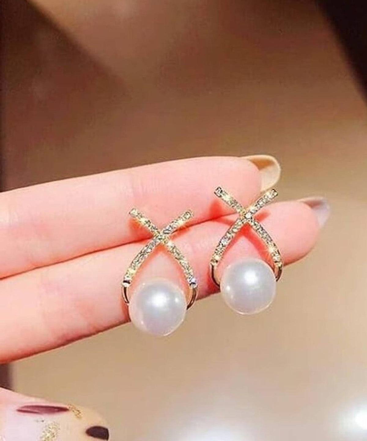 Cross Geometric Diamond Studded Pearl Earrings